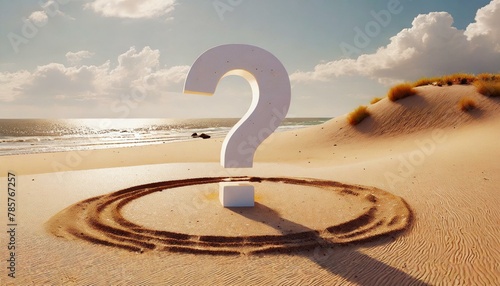 © Hiyoko maru, Obraz premium Art drawn on a sandy beach with a large white question mark in the center surrounded by a circle