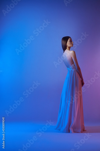 © angel_nt, Fototapeta premium Art fashion beautiful elegant woman in blowing flying dress. Freedom concept in neon color light. Fashion style of flowing dress on body woman