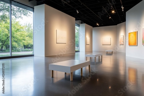 © Mandeep, Fototapeta premium art gallery interior with modern paintings and seating.