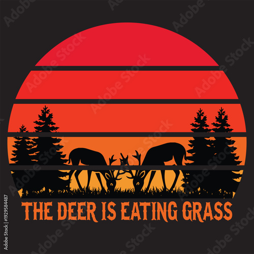 Obraz premium Art & Illustration Deer Silhouette Against Sunset with Trees and Glowing Sun