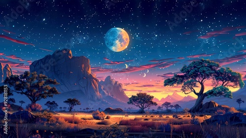 © Hammam, Fototapeta premium Art illustration of savanna on night