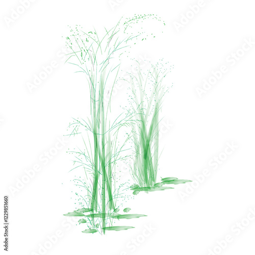 Fototapeta premium Art & Illustration vector of abstract plants and grass handmade with a brush in green color Green plants near the water depict a serene natural scene, suitable for environmental concept designs