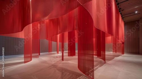 © Evon J, Fototapeta premium Art Installation of Cascading Red Fabric Sheets in Modern Gallery Space