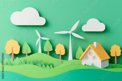 Naklejka premium Art made from paper, renewable energy including wind turbines, carbon-neutral...