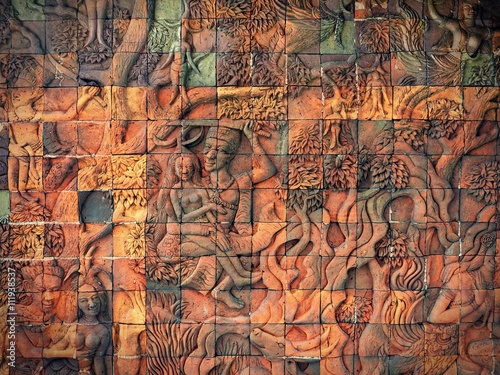 © Thitinat.K, Obraz premium Art on the stone about buddha story on temple wall
