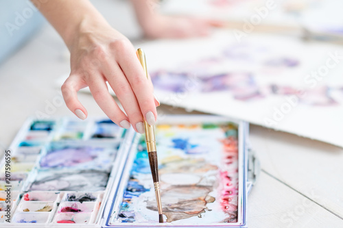 © golubovy, Naklejka premium art painting classes. creative hobby and self expression. hand mixing watercolors with a brush