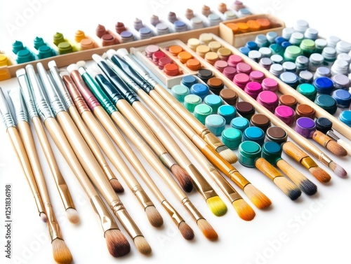 © Pornarun, Naklejka premium Art supplies including various paintbrushes and vibrant paints