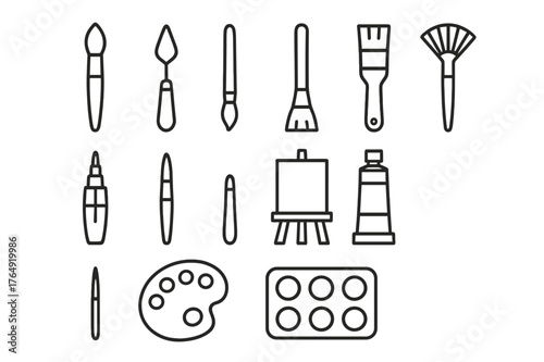 © Coosh448, Naklejka premium Art Tool Icons. Art and painting tools. Line icon set of art and painting tools: paintbrush, palette knife, round brush, flat brush, fan brush, water brush,