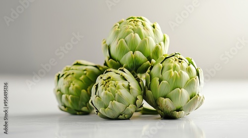 Fototapeta premium Artichokes are artfully arranged on a white table with soft gray and diffused...