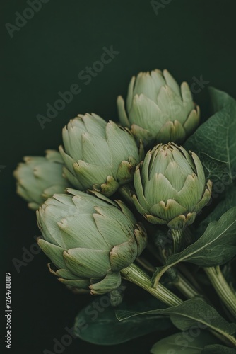 © Larisa, Fototapeta premium Artichokes arranged artistically against deep green backdrop, sh