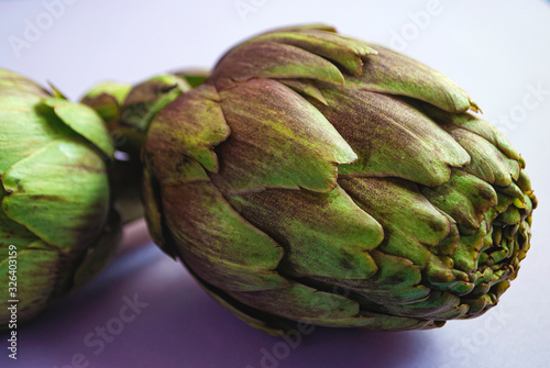 Obraz premium Artichokes close up on a purple surface.