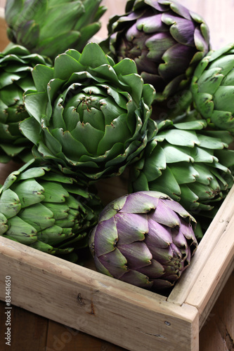 © uckyo, Obraz premium artichokes harvest in wooden box