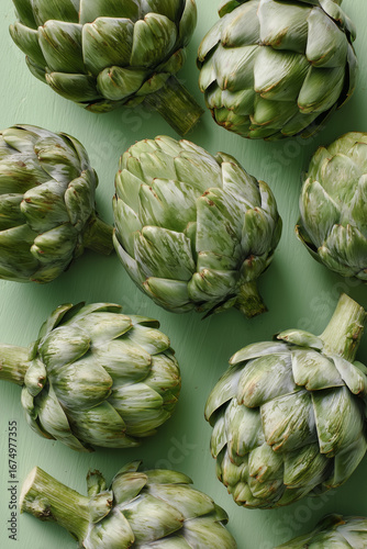 © Image soup, Obraz premium Artichokes on a Light Green Surface