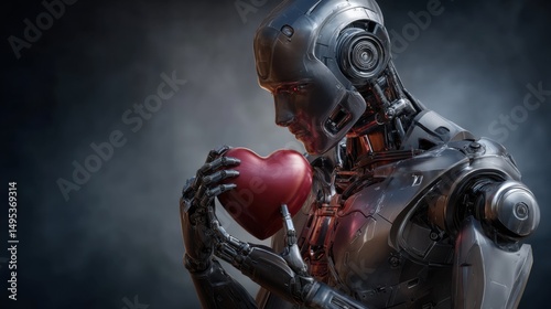 Fototapeta premium Artificial Affection: A futuristic humanoid robot tenderly cradles a symbolic heart, merging technology and emotion in a thought-provoking display.