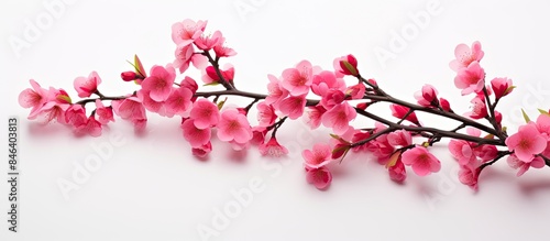 Naklejka premium Artificial branch of blossoming cherry with bright pink flowers isolated on white background copy space for text