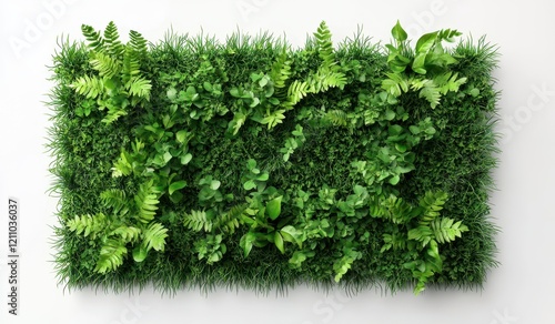 Fototapeta premium Artificial green plant wall with grass and leaves, isolated on a white background
