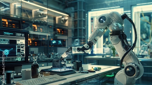 Fototapeta premium Artificial intelligence. AI's manufacturing prowess shown through an engineer programming a robotic arm