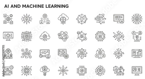Obraz premium Artificial intelligence and machine learning technology icon set. Outline...