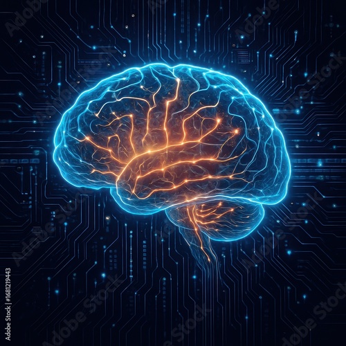 Fototapeta premium Artificial Intelligence Brain Network Visualization with Glowing Neural Connections and Circuit Patterns