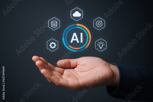 Fototapeta premium Artificial Intelligence Concept: Hand Presenting AI Circle with Cloud, Database, Goal, Gear, and Lightbulb Icons