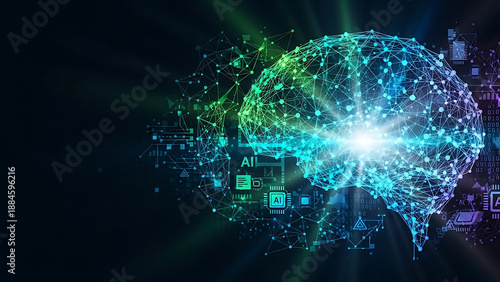 © Digital, Obraz premium Artificial intelligence concept showing a neon digital brain surrounded by abstract futuristic elements and data streams representing computation and deep learning