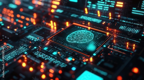 © Thamonchanok, Obraz premium Artificial intelligence future network and data science concept. Futuristic circuit board with glowing elements and a brain design.