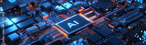 © don't panic ;), Obraz premium Artificial Intelligence in a complex and modern GPU card 3D rendering. AI generated illustration