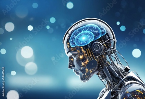 © olenakucher, Obraz premium Artificial intelligence in humanoid head with neural network thinks.
