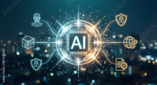 © solom, Obraz premium artificial intelligence microchip processor concept with digital neural network city background global data security encryption and machine learning automation for smart technology