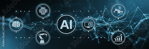 © Stock Studio, Obraz premium Artificial intelligence network connecting brain computer robot and data icons on dark blue background