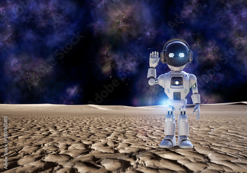 Fototapeta premium Artificial intelligence robot or robotic astronaut hand up for greeting from outer space