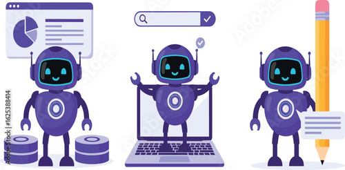 Fototapeta premium Artificial intelligence technology in business set. AI robot assistant analyzing data, business tasks, seo. Automation tools concept