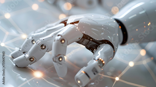 © S A H I N , Fototapeta premium Artificial intelligence technology robot hand typing on glowing infographic lines
