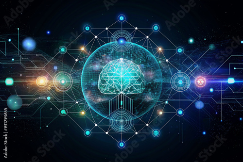 © Natalya, Obraz premium Artificial intelligence with network blue tech background, poster, banner, illustration