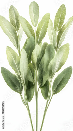© Lailatul, Obraz premium Artificial sage sprig, green leaves, isolated white background, home decor, crafting