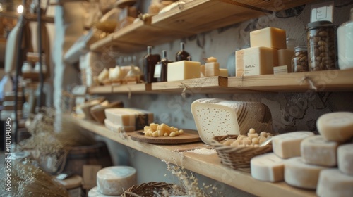 Naklejka premium Artisan cheese display with natural wooden shelves