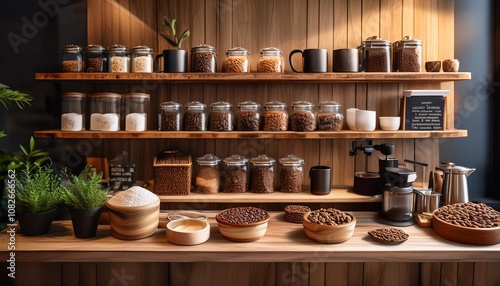 © arbi wiratama, Naklejka premium Artisan Coffee Bar Display Featuring Freshly Ground Coffee Beans, Gluten-Free Baked Goods, and Organic Condiments for a Sophisticated and Cozy Home Cafe Experience