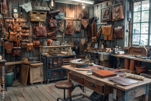 Obraz premium Artisan's Studio Featuring Handmade Leather Items in Progress - Creative Workspace for Craftsmen