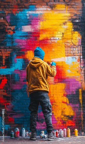 © ngamaz, Obraz premium Artist creating vibrant graffiti art on a brick wall.