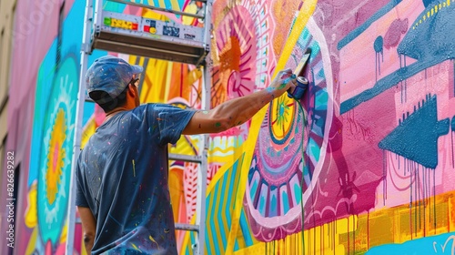 © Nigar, Fototapeta premium Artist Painting Colorful Urban Murals. Description: Photos of artists painting large, vibrant murals on urban walls, showcasing creative street art.