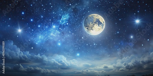 Naklejka premium Artist rendering of a night sky with a full moon, stars, and bright light , moon, night, sky, stars, bright, light