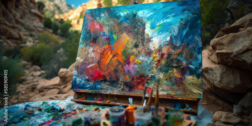 Fototapeta premium artist's easel standing at the edge of a cliff, vibrant natural scene (created with Generative AI)