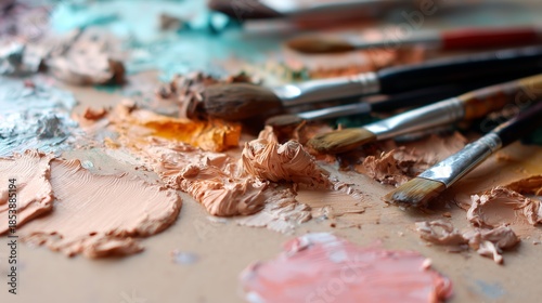 Naklejka premium Artist uses brushes and colors on a workspace filled with paint and tools in...