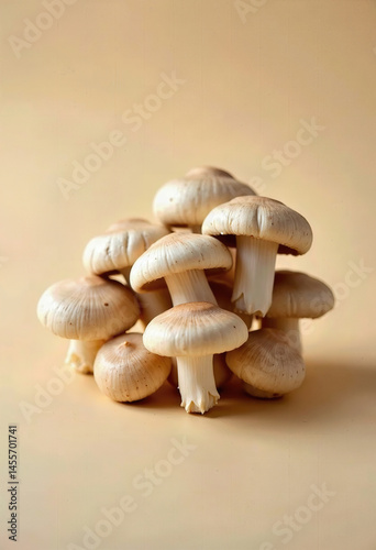 Fototapeta premium Artistic Arrangement: A Captivating Close-Up of Fresh Oyster Mushrooms Clustered Together, Their Light Beige and Soft Brown Tones Accentuated by Soft, Natural Lighting