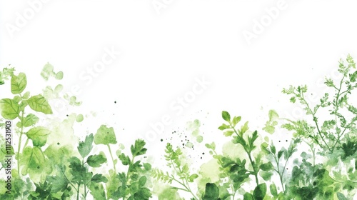 © 69, Fototapeta premium Artistic arrangement of fresh herbs in watercolor, vibrant green tones against a crisp white background