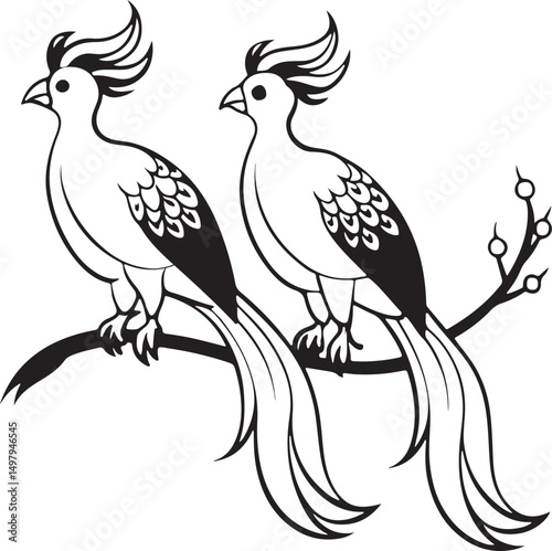 Fototapeta premium Artistic bird illustration showing pair of roosters with dynamic tails in...