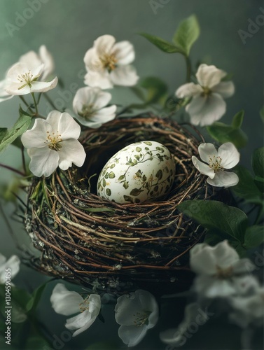 Fototapeta premium Artistic Bird Nest with Decorative Egg Surrounded by White Spring Blossoms...