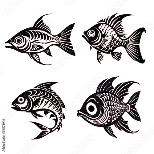 © Harun, Fototapeta premium Artistic black and white illustrations of various fish bundle showcasing unique designs and patterns