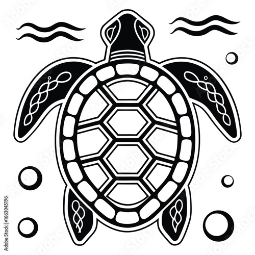 Obraz premium Artistic black and white outline of a sea turtle with celtic knot patterns and bubbles