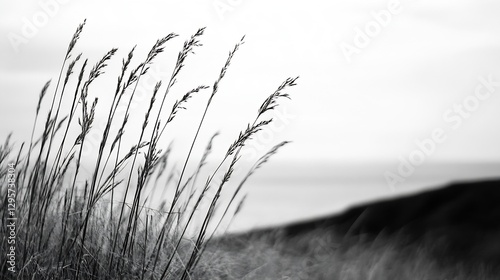 © Generative AI, Obraz premium Artistic black and white photograph of tall grass swaying gently in the wind near a coastal area : Generative AI